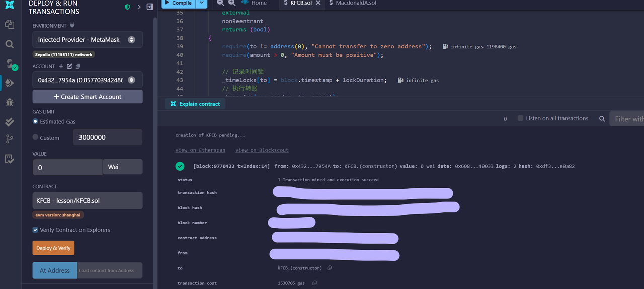 返回Remix编译器中,点击 “Deploy & run transactions”,环境选择”Injected Provider - MetaMask”,账户填写为对应的以太坊钱包地址,合约选择后点击”Deploy&Verify“开始部署,待Metamask确认完成后,Remix控制台会开始生成交易哈希并等待区块确认,此时**务必记录下每个合约的地址(contact address)**;(图中仅以一个部署为例)