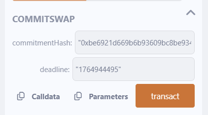 根据deadline(就是时间戳,可从在线网站查看,但由于合约机制需要加预先时间)和commitimenthash,找到CommitSwap函数入口,将得到的结果输入后,可transact,完成初步的Cmmit端,需要保留得到的结果值以备后患;
