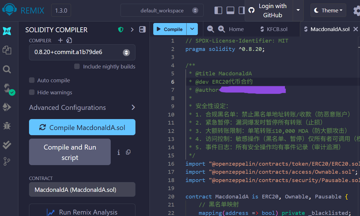 本文中构建的两款具备差异化安全特性的ERC20标准代币MacdonaldA与KFCB,核心目标在于遵循ERC20代币基础规范的同时,针对区块链交易中常见的安全风险引入针对性防护机制。合约开发严格遵守Solidity0.8.20版本语法规范,利用语言内置的溢检查特性替代传统SafeMath库,在精简代码体量的同时保障基础运算的安全准确。