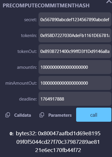 commithash=keccak256(abi.encodePacked(secret,toeknIn,amountIn,minAmountOut,deadline))(唯一性),将交易细节隐藏;揭示阶段: