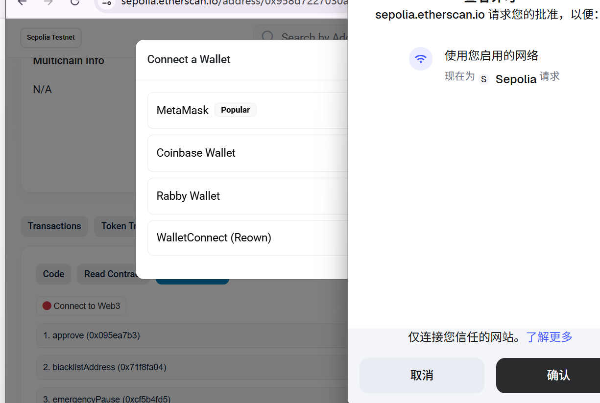 注意在钱包选择环节记得切换网络,因为它会自动默认连到主网上,需要手动切换到Sepolia testnet,部署成功后务必在命令行中点击