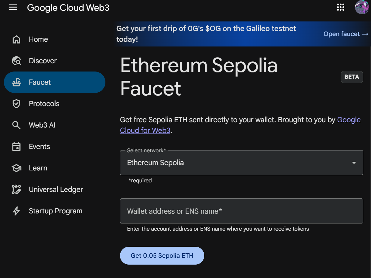 随后我们在网络中检索faucet发放网站,发现利用谷歌云[https://cloud.google.com/application/web3/faucet/ethereum/sepolia]可以通过登录账号,填写钱包地址领取0.05 ETH/d;